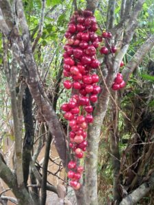 Terdapat bunga yang tidak beraroma dan berkelompok dalam bentuk tandan. Ada pun buah yang berukuran 3,5 – 2,5 cm, menghasilkan 3 biji, berwarna hijau saat muda, dan merah keunguan yang mirip layaknya buah anggur.